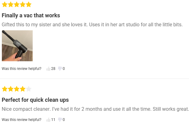 “It works well for quick cleaning, especially in tight spaces where my big vacuum can’t reach. I like how lightweight and easy it is to use. That said, don’t expect it to replace a regular vacuum—it’s more for small messes. Also, the dust container fills up pretty fast, so you have to empty it often. Overall, good for what it’s designed for, just know its limits.